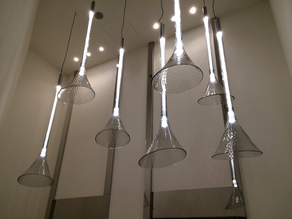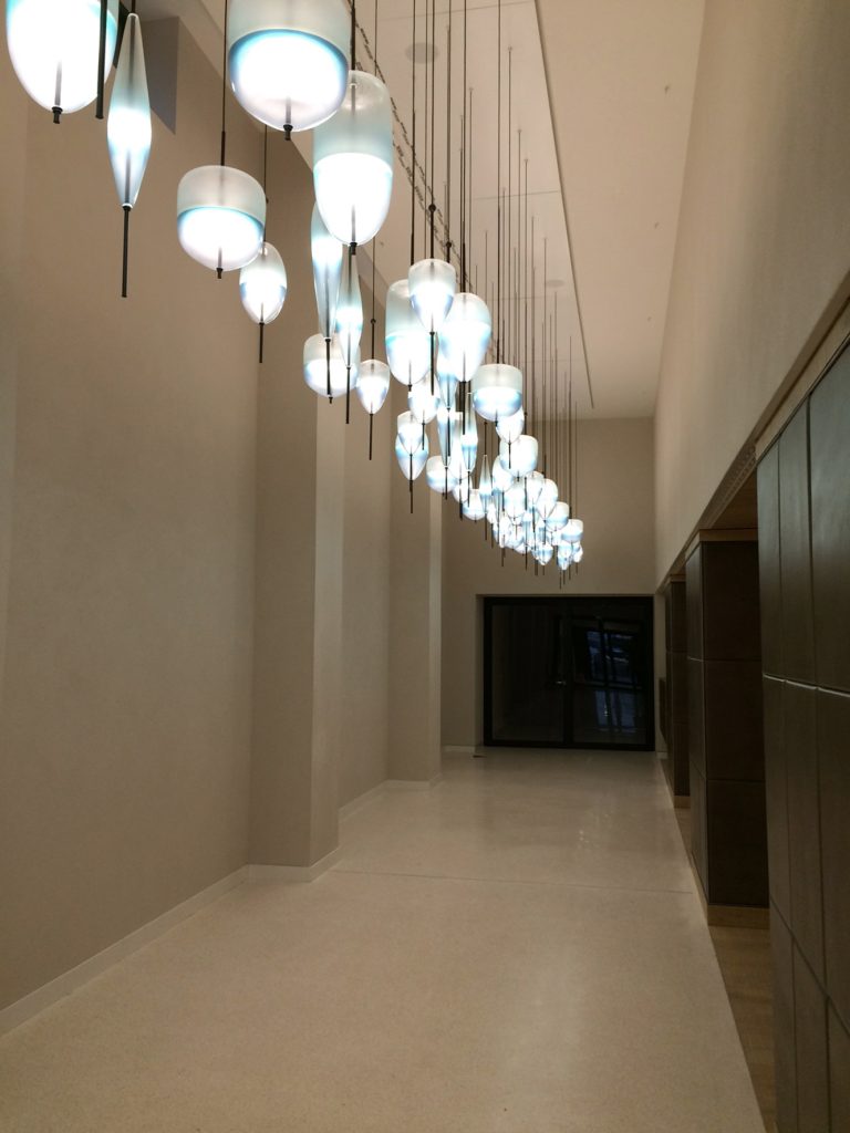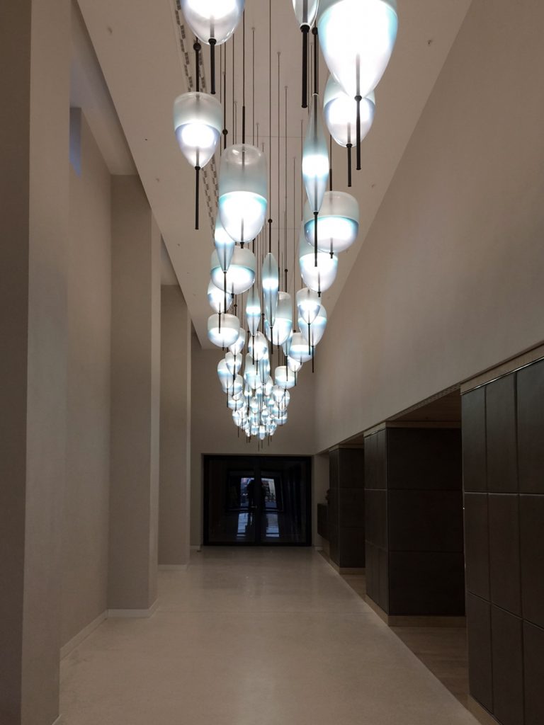 Flow[T] by Nao Tamura and Luma by Zaha Hadid, both pieces of WonderGlass collection, have been chosen for the interior decoration of the building by the architect Kate Hume. The cool and natural tones of these pieces create elegance and dynamism on the inside of a perfectly developed architectural project.