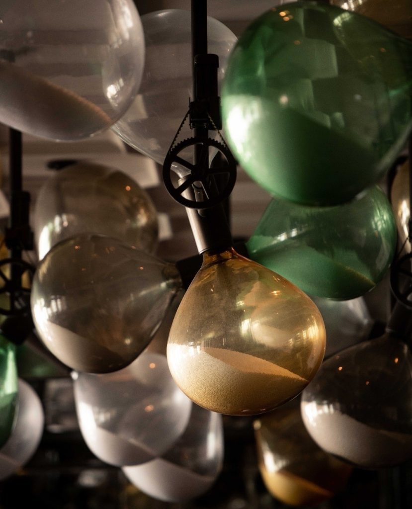 Handcrafted in Murano, the perpetually rotating hourglass ceiling installation captures the romantic passage of time, marking it in both a playful and solemn way. The sand used for the hourglass is pigmented with a selected colour palette to compliment the atmosphere of the bar.