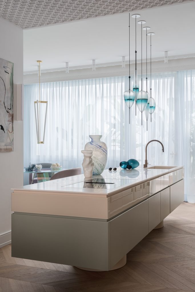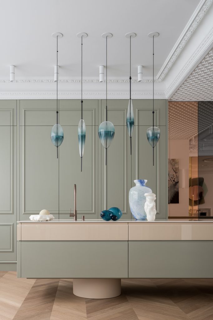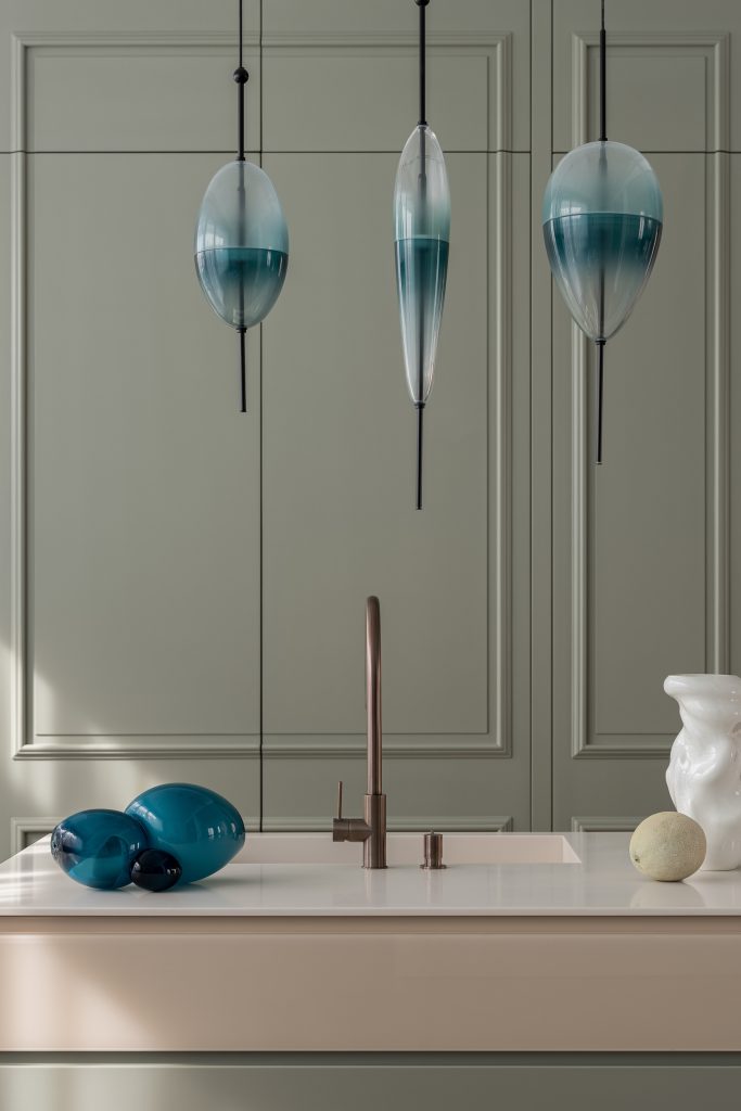 Subtle lines such as the one created by the coloured Flow[T] by Nao Tamura, enrich the interior aesthetic. The chandelier with its handmade qualities complements the open-space with a play of transparencies and green hues, matching the flowing curtains.