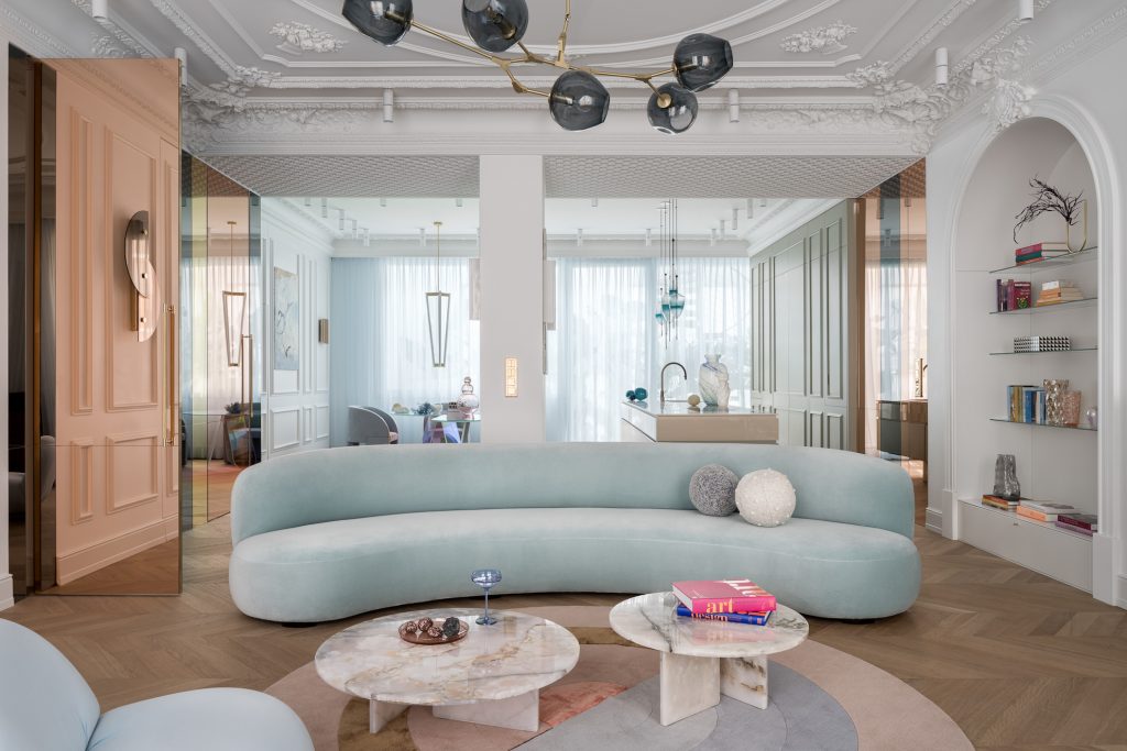 The project combines classic and modern outstanding design with tasteful materials and organic shapes. The simple form of the furnitures and colour selection of the decorations, range from bright to pastel, create playable room. Wood and earthy colours are paired with stucco and classic walls, becoming the perfect backdrop for a contrast between organic edges and geometric forms.
