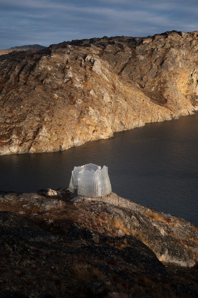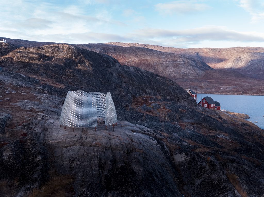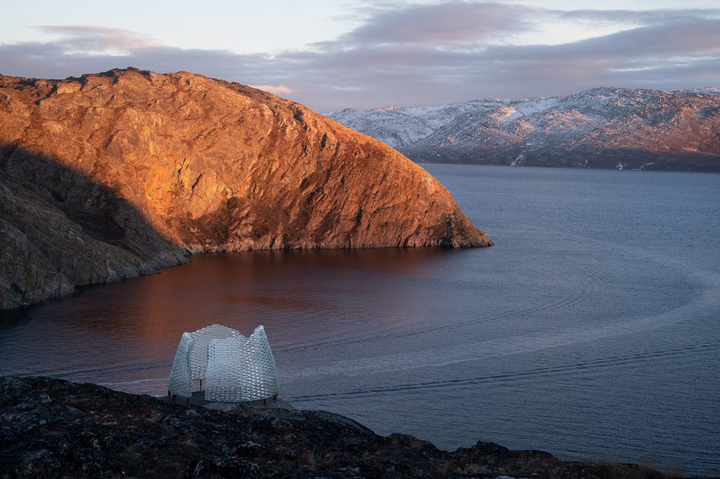 Located in Sarfannguit, a cultural landscape in West Greenland and a UNESCO World Heritage site since 2018, the Fjeld Pavilion by Konstantin Ikonomidis is designed to celebrate and promote the Inuit intangible cultural heritage and traditional knowledge of the environment. Characterized by the two fjords that meet on Sarfannguit’s eastern tip on the hills, the pavilion’s location has been carefully chosen by the local community, site manager Paninnguaq Fleischer-Lyberth and architect Konstantin Ikonomidis for its impressive view over the Sarfannguit municipality.