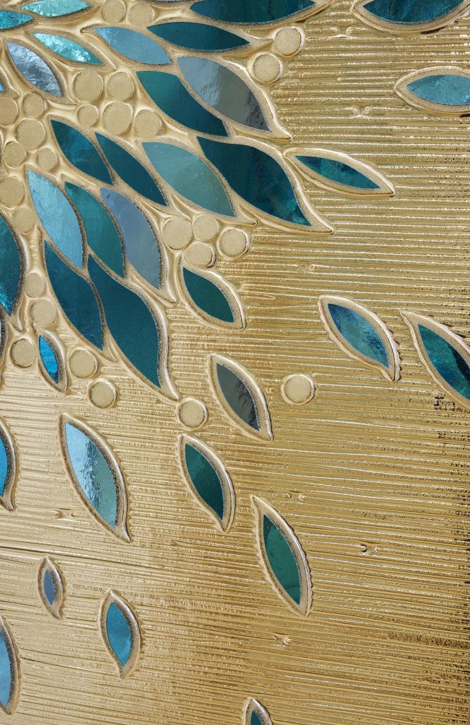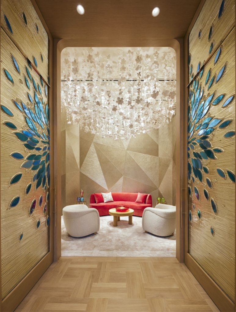 Schlumberger’s aesthetic vernacular finds echoes throughout the sequence of gently delineated spaces, rooms and alcoves, lastly reaching a crescendo on the 12-foot-high custom glass doors leading to the Private Sales rooms. Here, WonderGlass’s fused and handblown glass artisans realised Tiffany’s design inspired by Schlumberger’s coveted Flame Earring, with inset iridescent almondine glass lozenges glittering against the door’s patinated gold and champagne undertones in a manner similar to the brand’s cloisonne portfolio. The exaggerated supernova motif is emphasised by the doors’ flanking fine-woven panels, extemporising on the sunburst form.