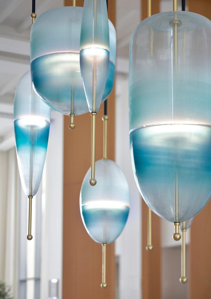For this project, WonderGlass manufactured a bespoke special edition of Flow[T] by Nao Tamura enlarged and oversized to strengthen the idea of the sea and a pop of colour in the middle of the room.
